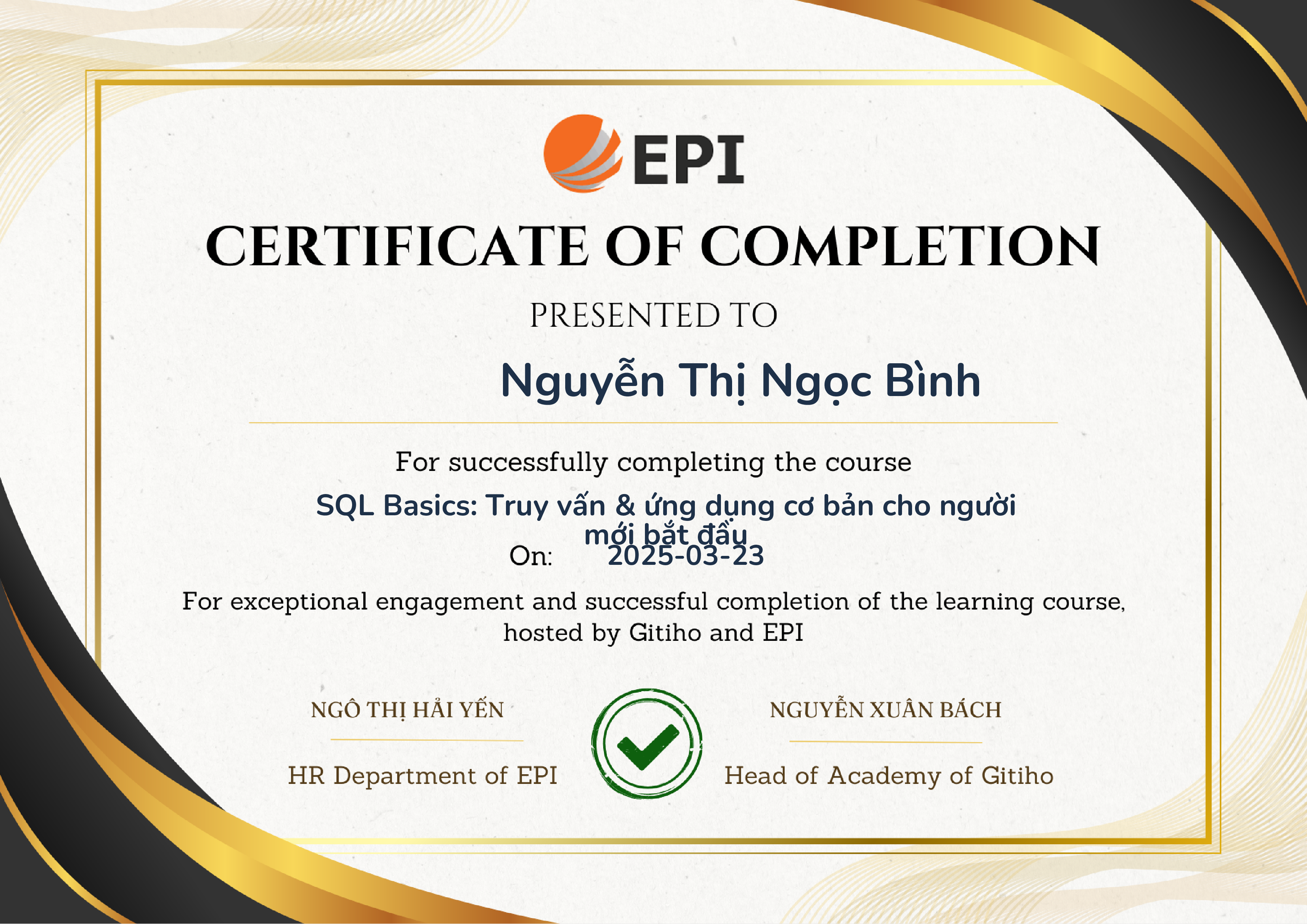Chứng nhận hoàn thành chương trình tại: CÔNG TY TNHH CÔNG NGHỆ EPI VIỆT NAM